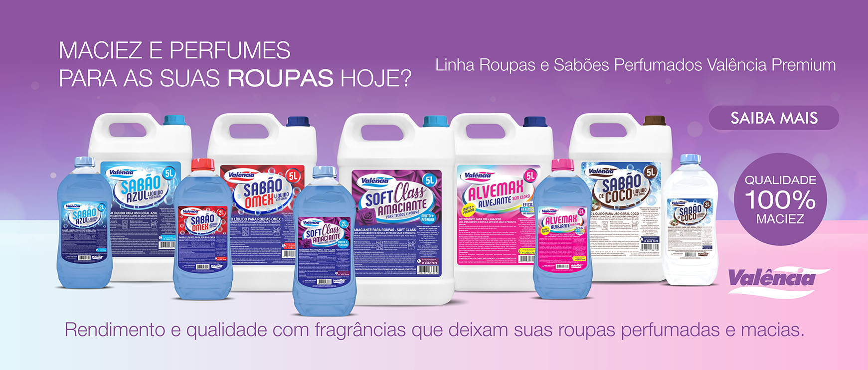 A Linha de Desinfetantes Valência limpa, perfuma e desinfeta eliminando e protegendo ambientes contra vírus e bactérias com fragrâncias marcantes e duradouras.
