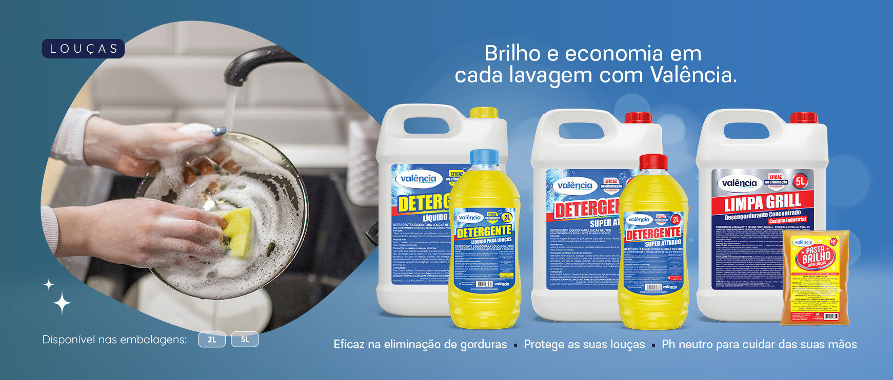 Os detergentes para Louças Valência são perfeitos para lavar com eficiência e economia todos os tipos de louças e superfícies.