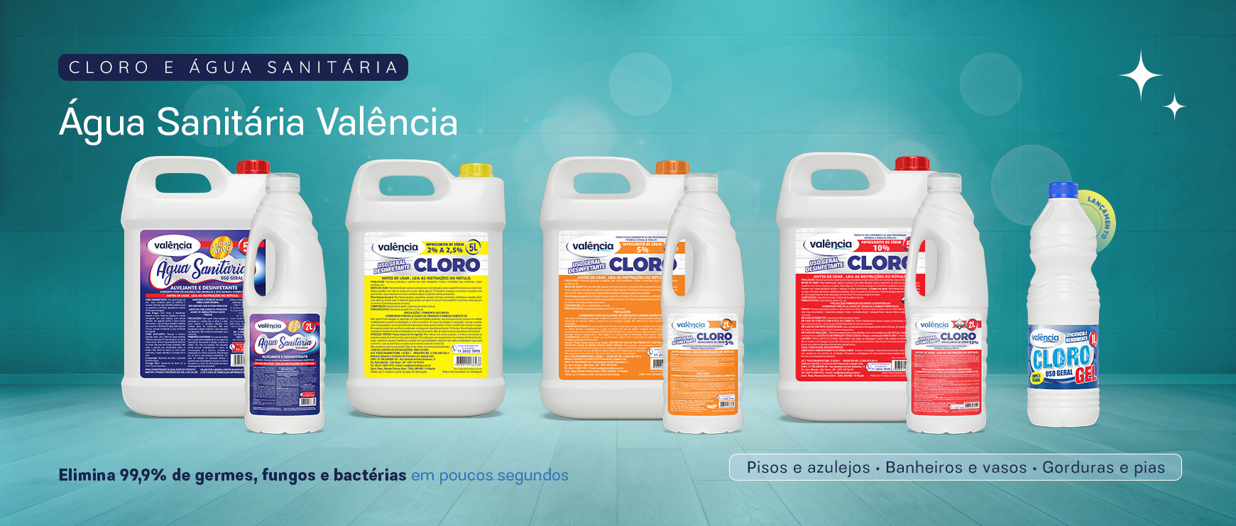 Item indispensável na limpeza e queridinha dos consumidores, a Linha de Cloros Valência vem completa para eliminar 99,99% das bactérias, fungos, germes, vírus e desinfetar superfícies.
